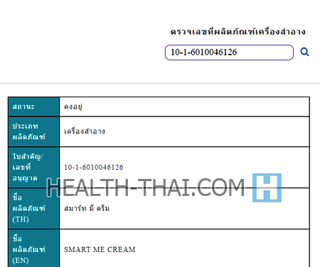 ตัวอย่าง เลขจดแจ้ง Smart Me Cream